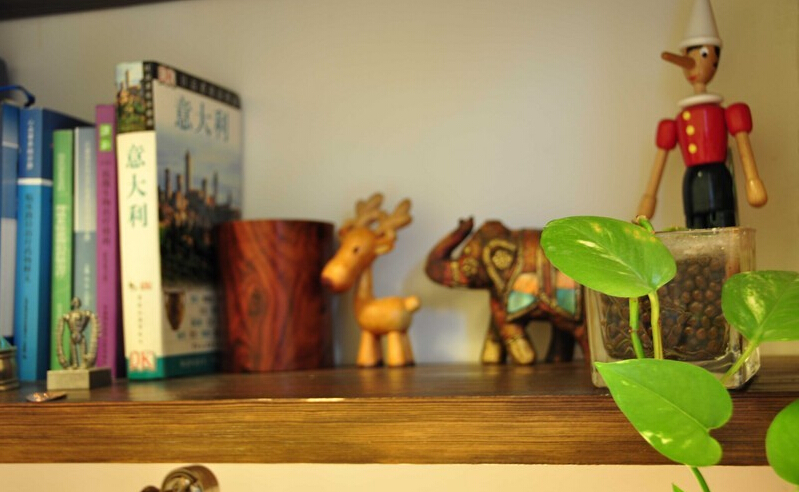 书房的摆件相对比较零碎,红木的笔筒,北海道的小鹿,印度的大象,意大利的匹诺曹排排队;手工的森林乐团指挥,希腊的小船,还有HH的纸镇。